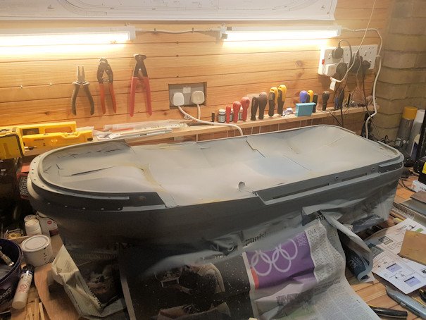 First grey primer coat to upper hull.