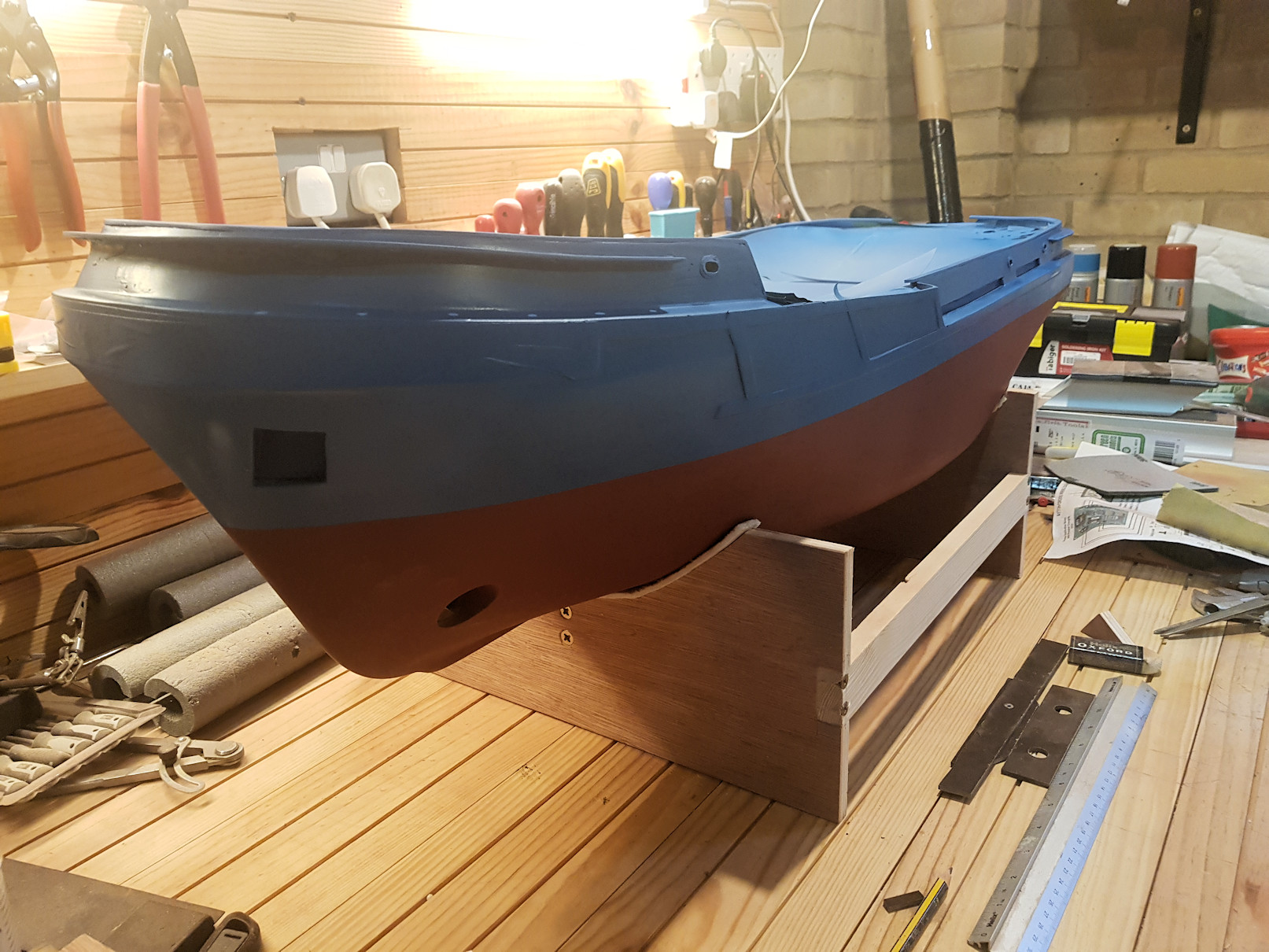 Sheer and rubbing strakes masked and first red oxide coating to the hull.